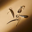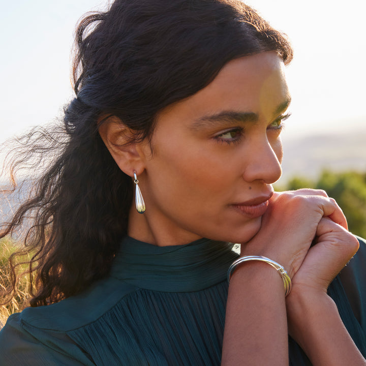 These sculpted earrings, smaller yet equally striking compared to the popular Raya Baton Drops, carry an inherent versatility with their hollow structure. Their rippled surface beautifully scatters and softens light, adding to their allure.