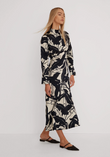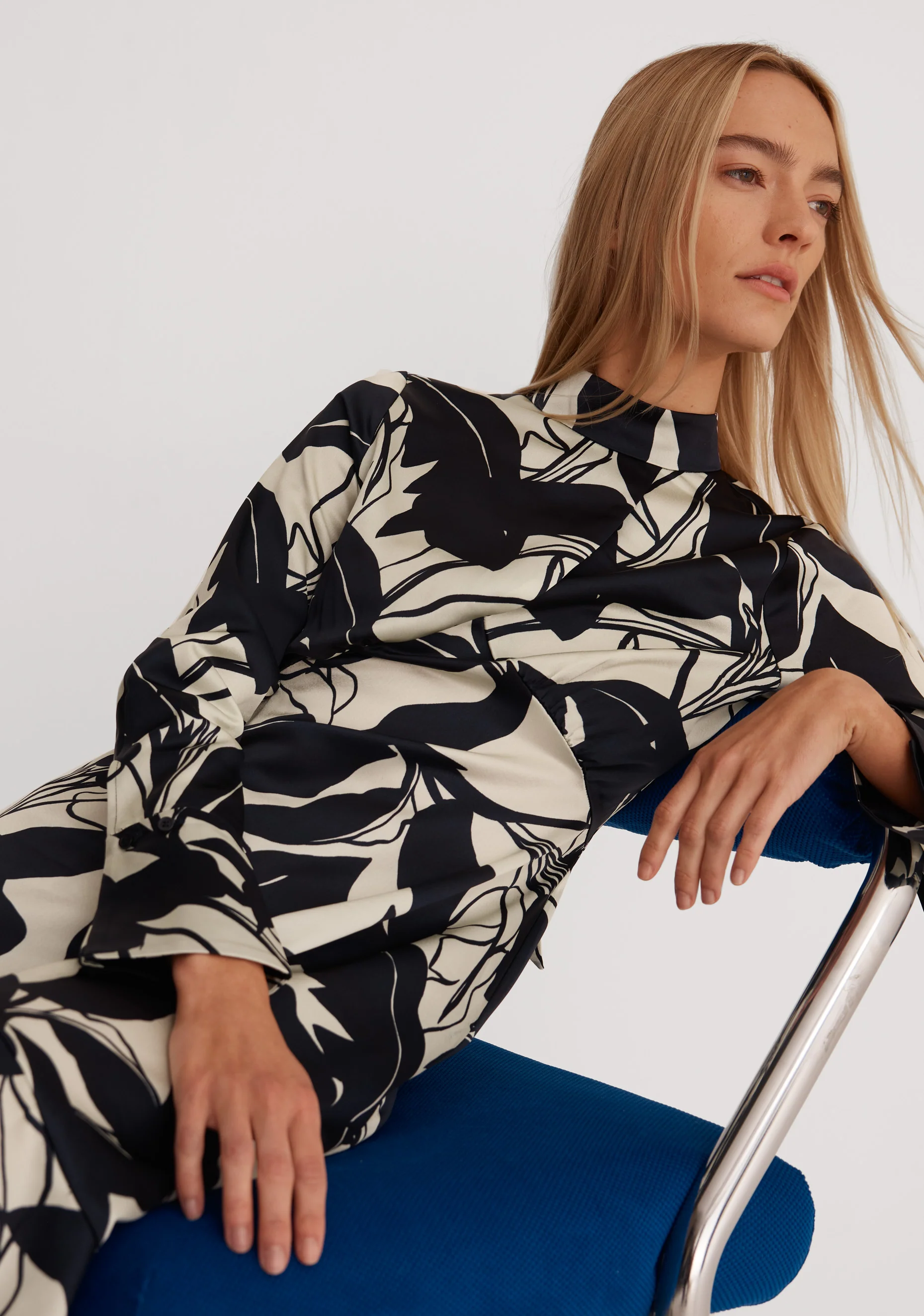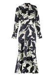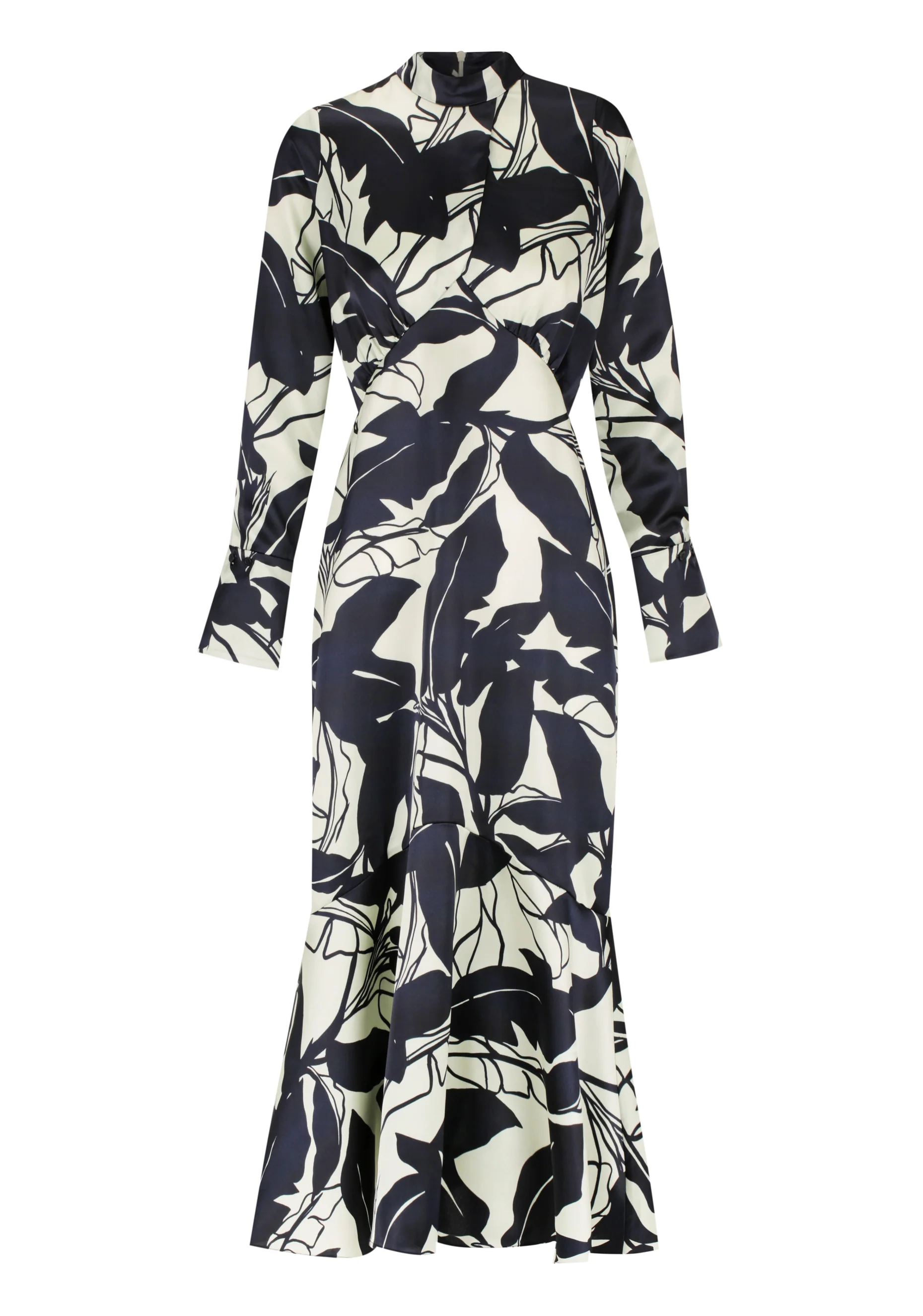 The Morrison Sabine Dress in exclusive Morrison print is a sophisticated piece crafted from an acetate blend satin. Featuring a stand collar and a versatile tie that can be worn at the front or back, this dress offers an elegant look.