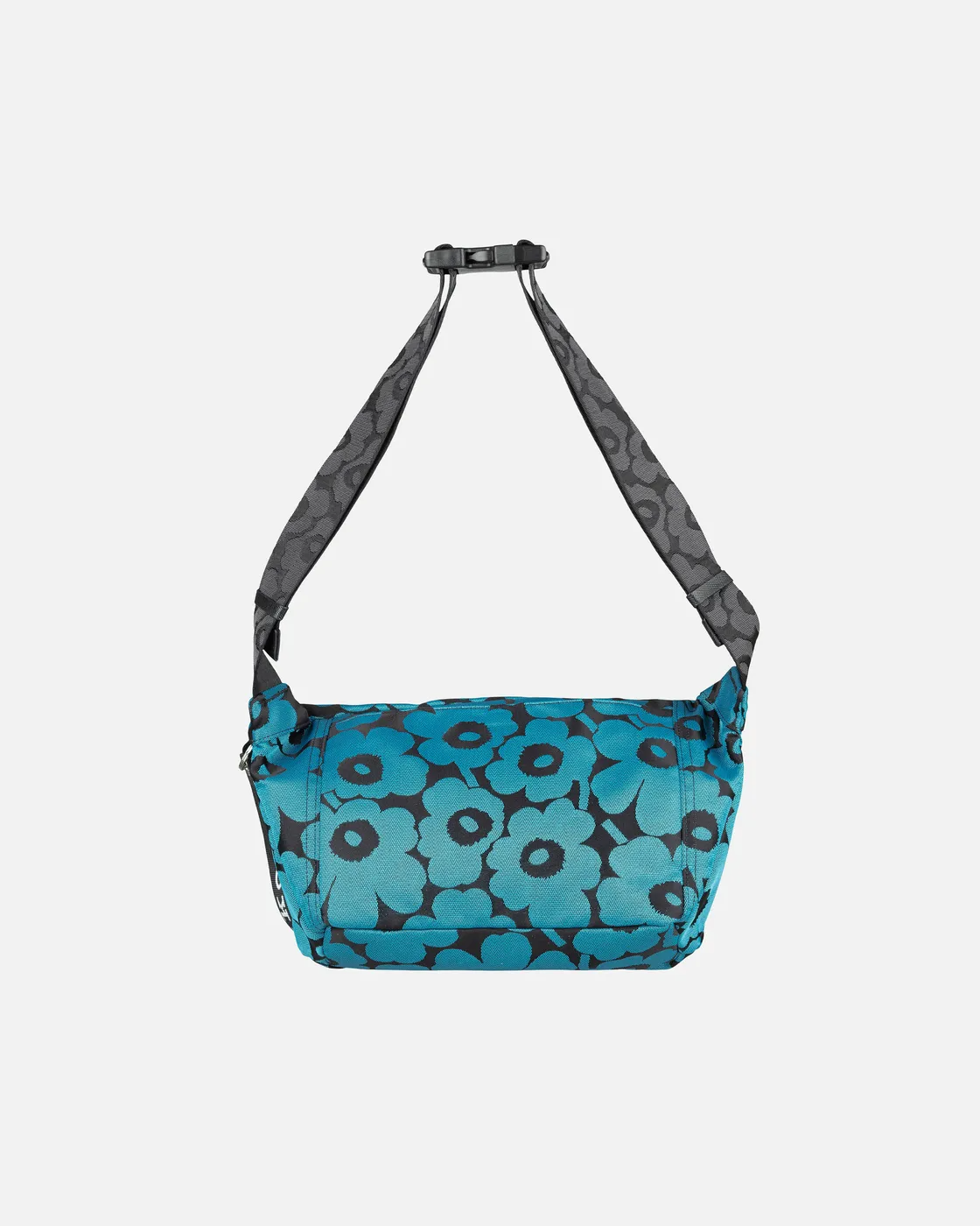 The Marimekko Sling Bag M crossbody features the jacquard knit Unikko pattern. The bag has a zipper closure, a handle, and an adjustable shoulder strap with a buckle, both with the jacquard knit Unikko pattern. There are two flap pockets in the front with magnetic closures, a zipper pocket on the inside, and a back outside pocket that closes with a magnetic button. The Marimekko keychain is attached to the front.