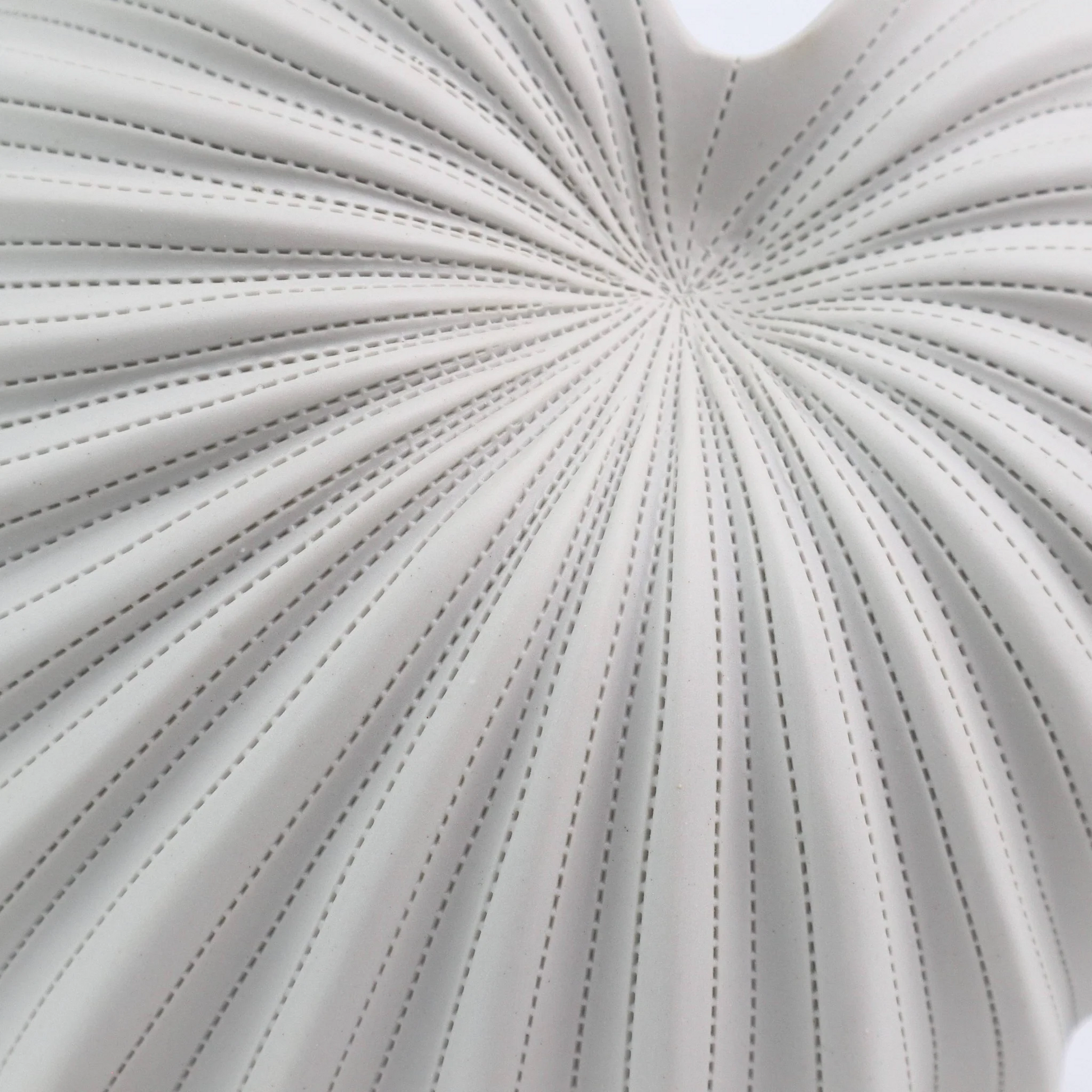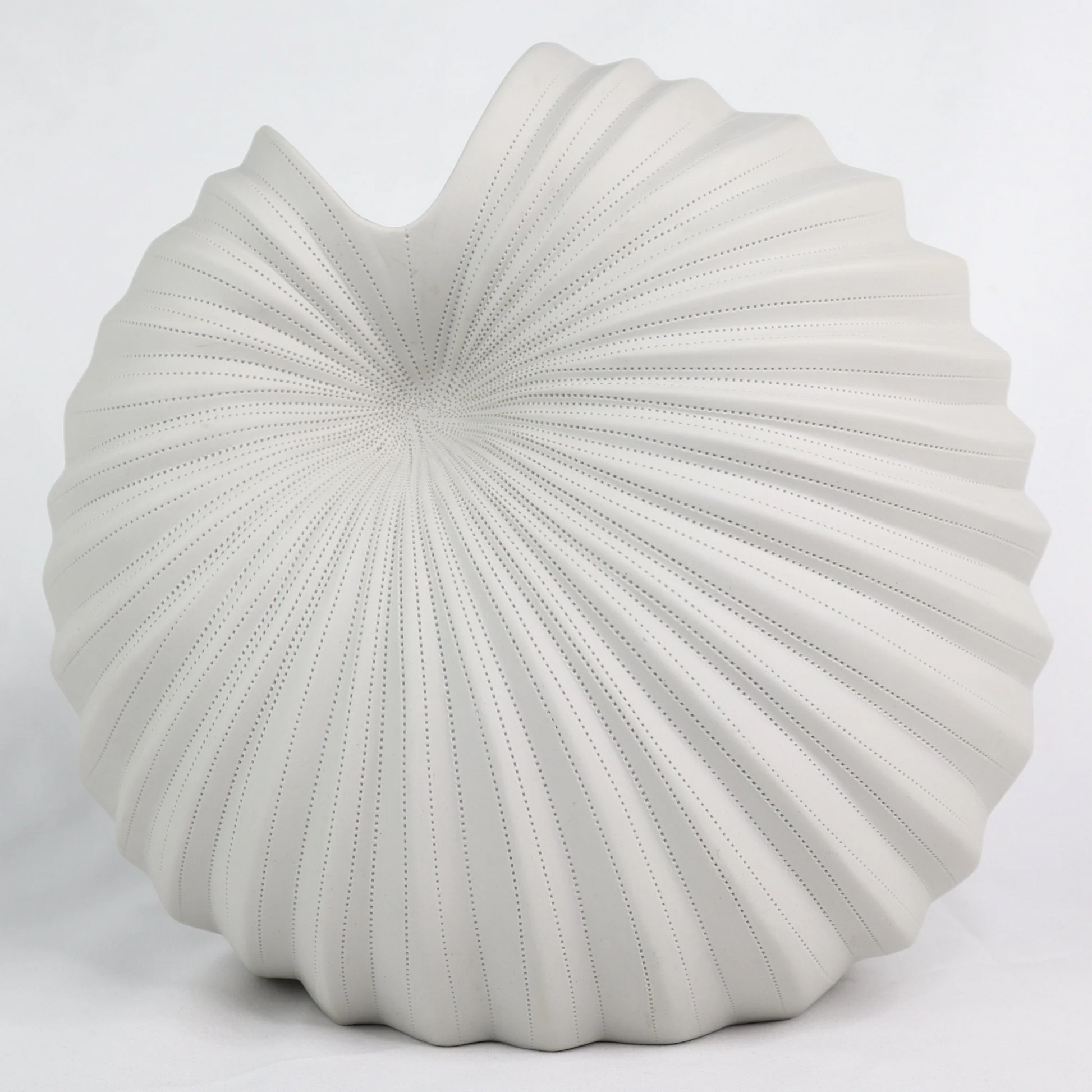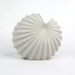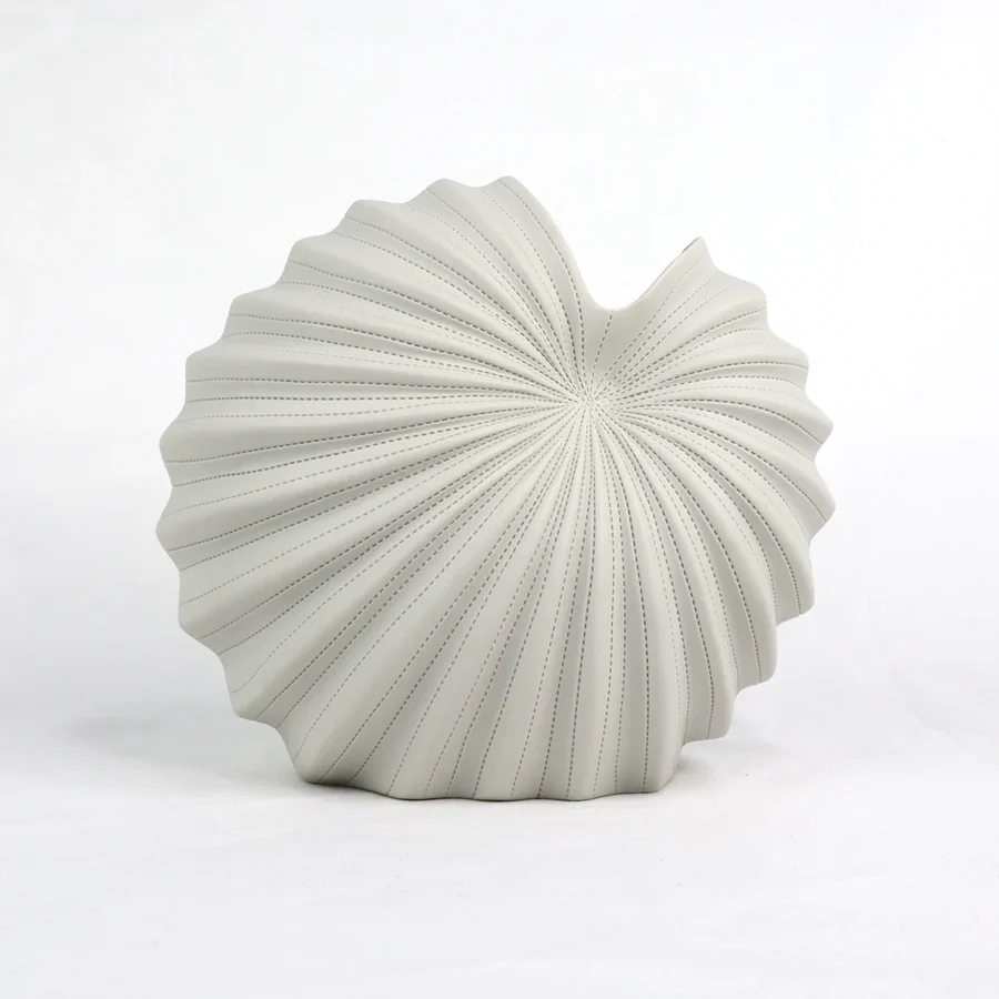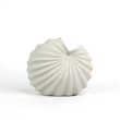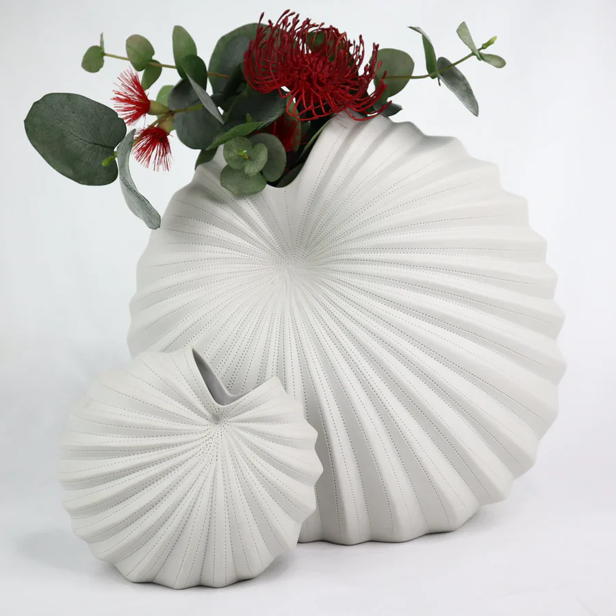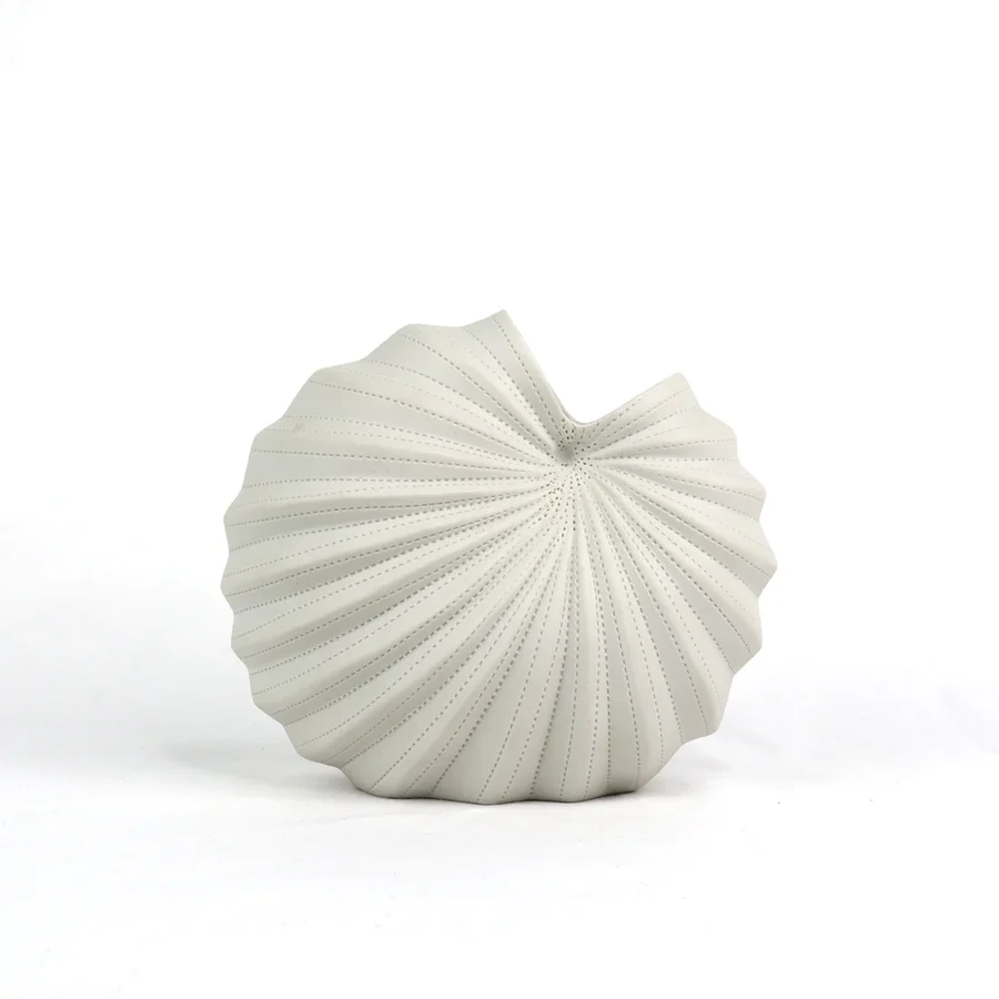 Introduce a sculptural statement to your space with the Roshi Spiral Vase—a piece where art meets function. With its asymmetrical, conch-like silhouette and hand-etched pinstripe grooves, this chalk white vase evokes the quiet beauty of oceanic forms and deep-sea curiosities. The textured, matte finish adds depth, while the fully glazed interior makes it perfect for fresh floral arrangements or propagating plant cuttings.