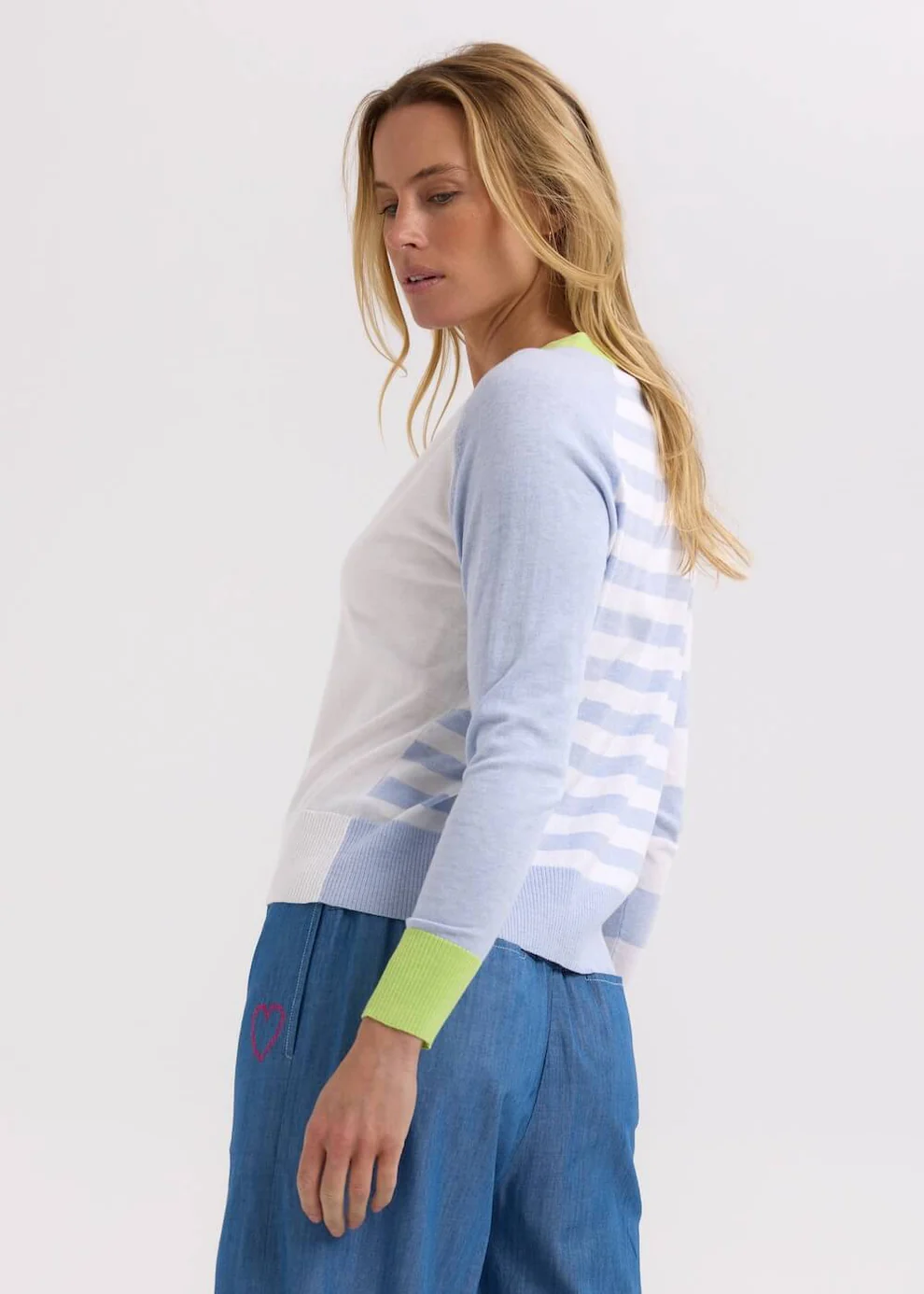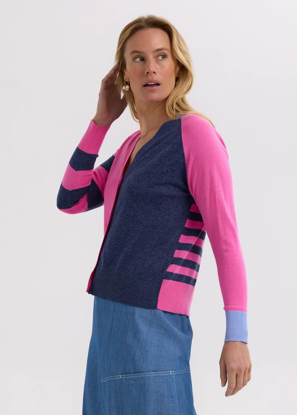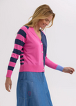 The Split Cardi by Zaket & Plover is a vibrant twist on a best-loved silhouette. Featuring an asymmetrical design with contrasting tones, vertical and horizontal stripes, and standout cuffs, it’s a knit that’s full of personality.