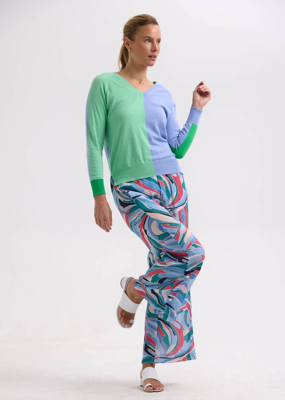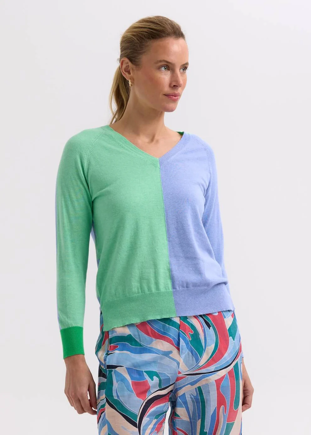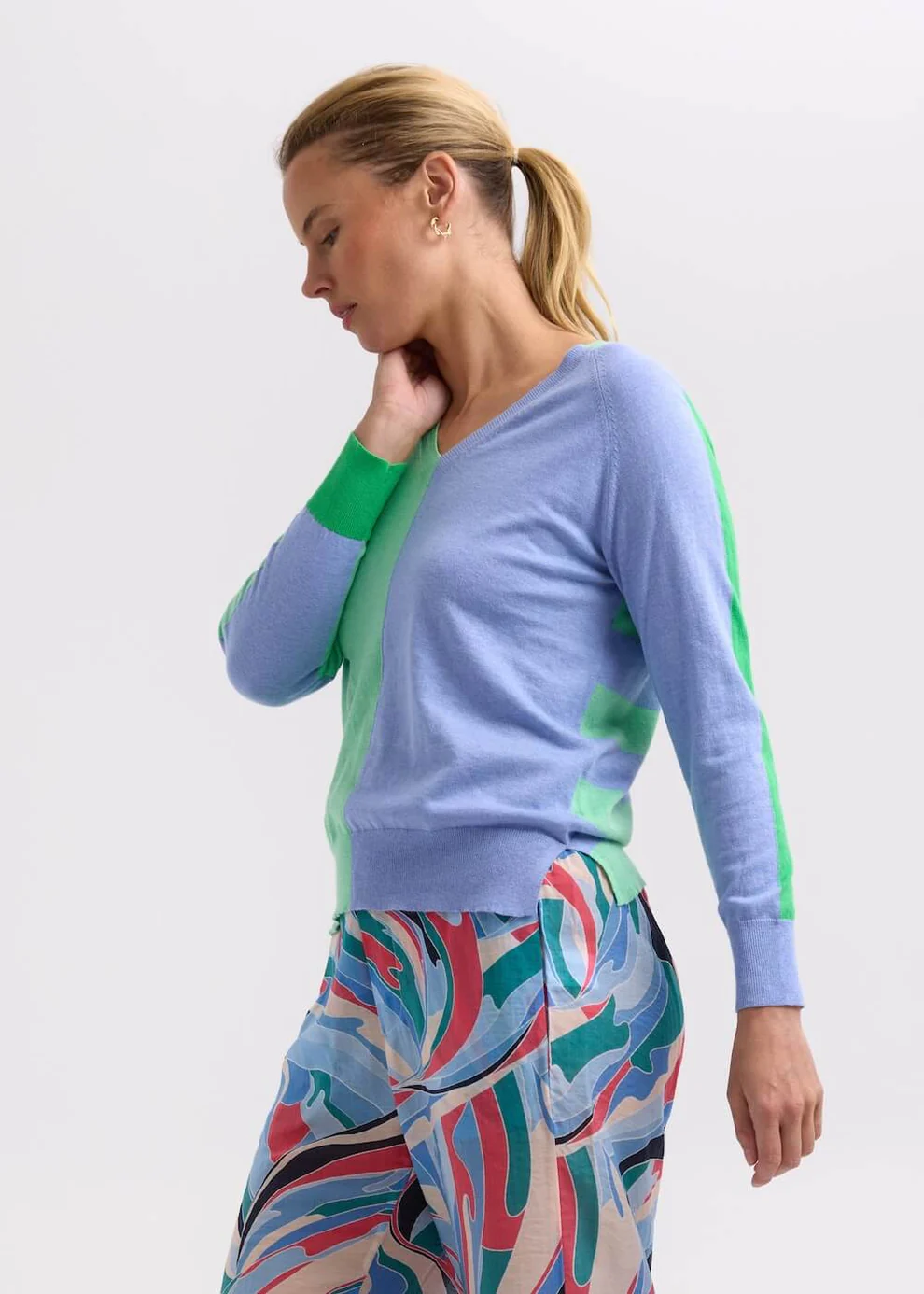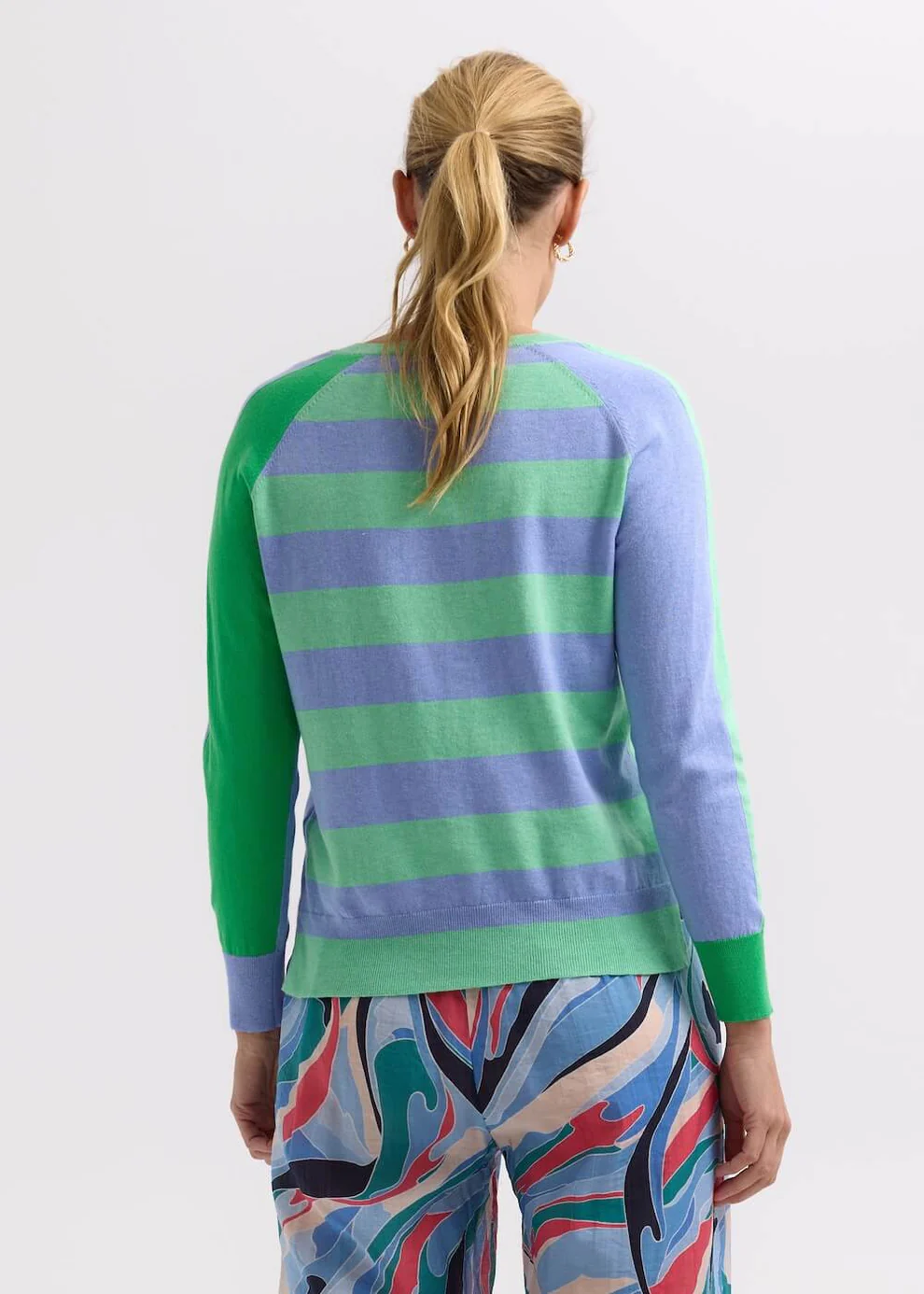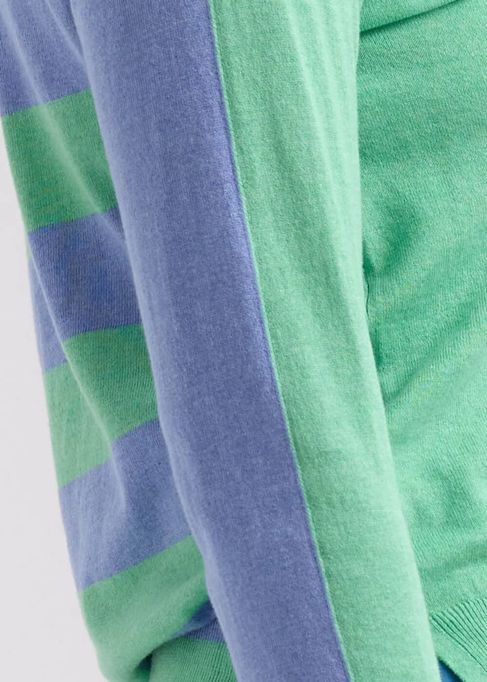 The Zaket & Plover Split Jumper in Spearmint is a refreshing twist on classic knitwear. With its playful mix of vertical and horizontal stripes in cool, calming tones, this jumper brings colour blocking to life. Crafted from a lightweight cotton-silk blend, it offers softness and breathability in a flattering, semi-relaxed fit. Finished with a V-neckline and contrast cuffs, it’s the perfect trans-seasonal layer to brighten your everyday style.