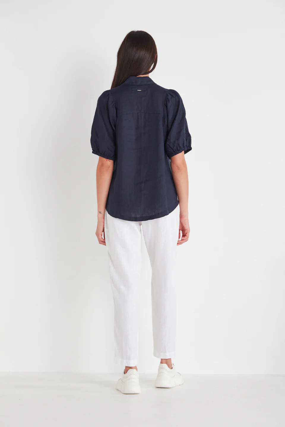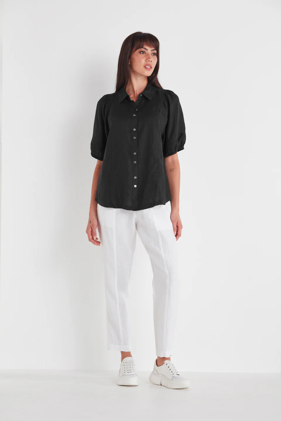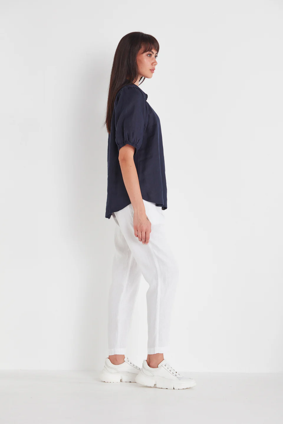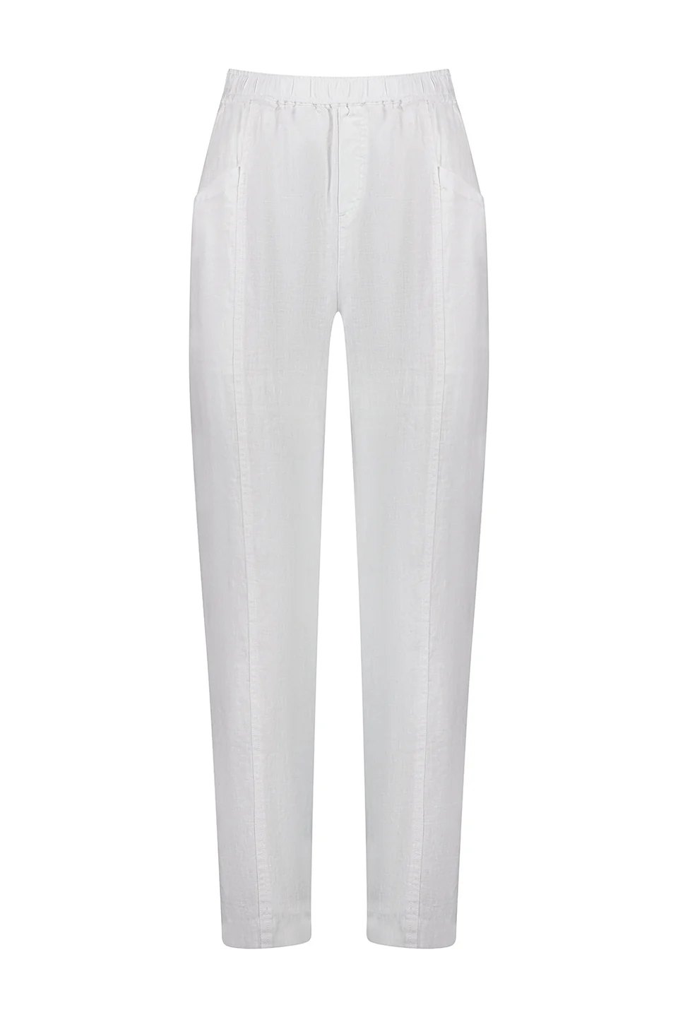 The Verge Taylor Pant, crafted from 100% linen, offers ultimate comfort with its elasticated waistband and relaxed slim-leg design. Featuring side pockets and a sleek front seam detail, this ankle-length pant is the perfect blend of style and ease.