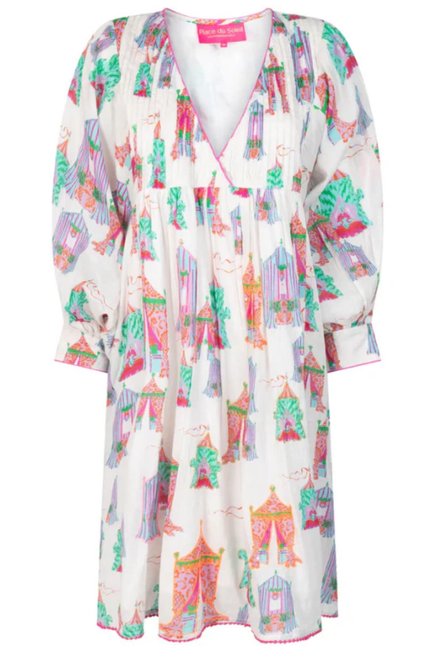 Embrace summer style with the Tea Tents Short Dress by Place du Soleil, a lightweight and playful dress perfect for sunny holidays. Crafted from breathable 100% cotton, this relaxed-fit dress features a vibrant multicoloured tea tent print on a crisp white base, short puff sleeves, and a flattering v-neckline. Intricate embroidery adds a subtle touch of detail, while the empire line and oversized fit create effortless comfort and flow.
