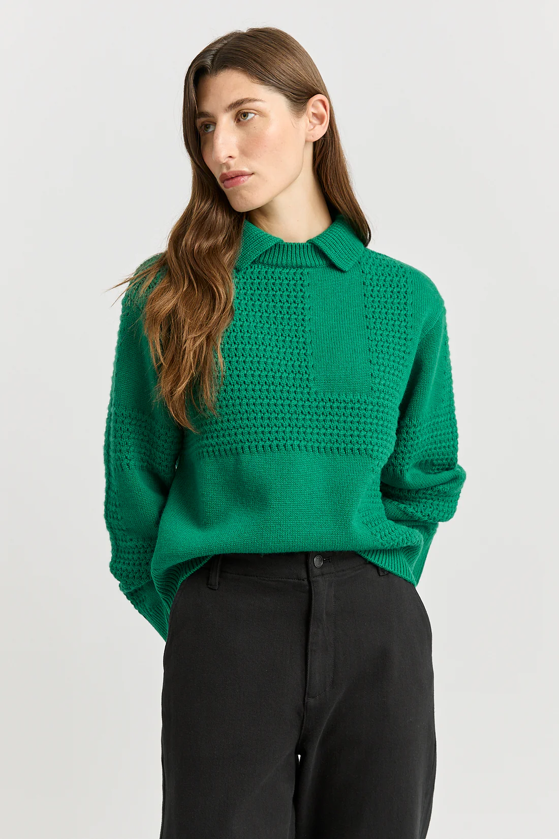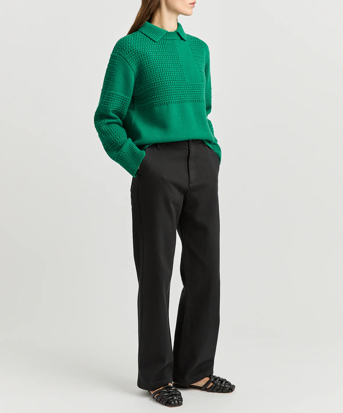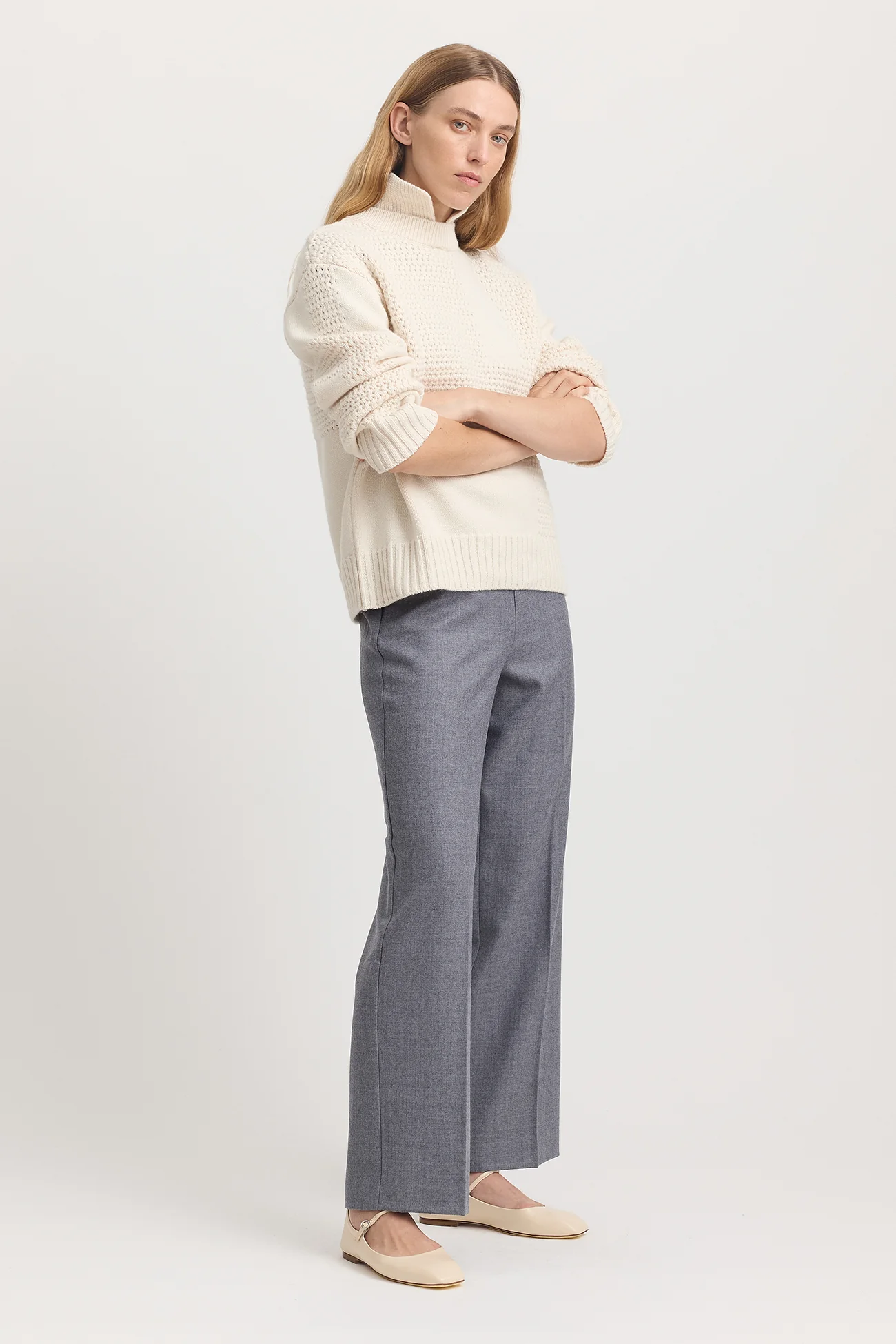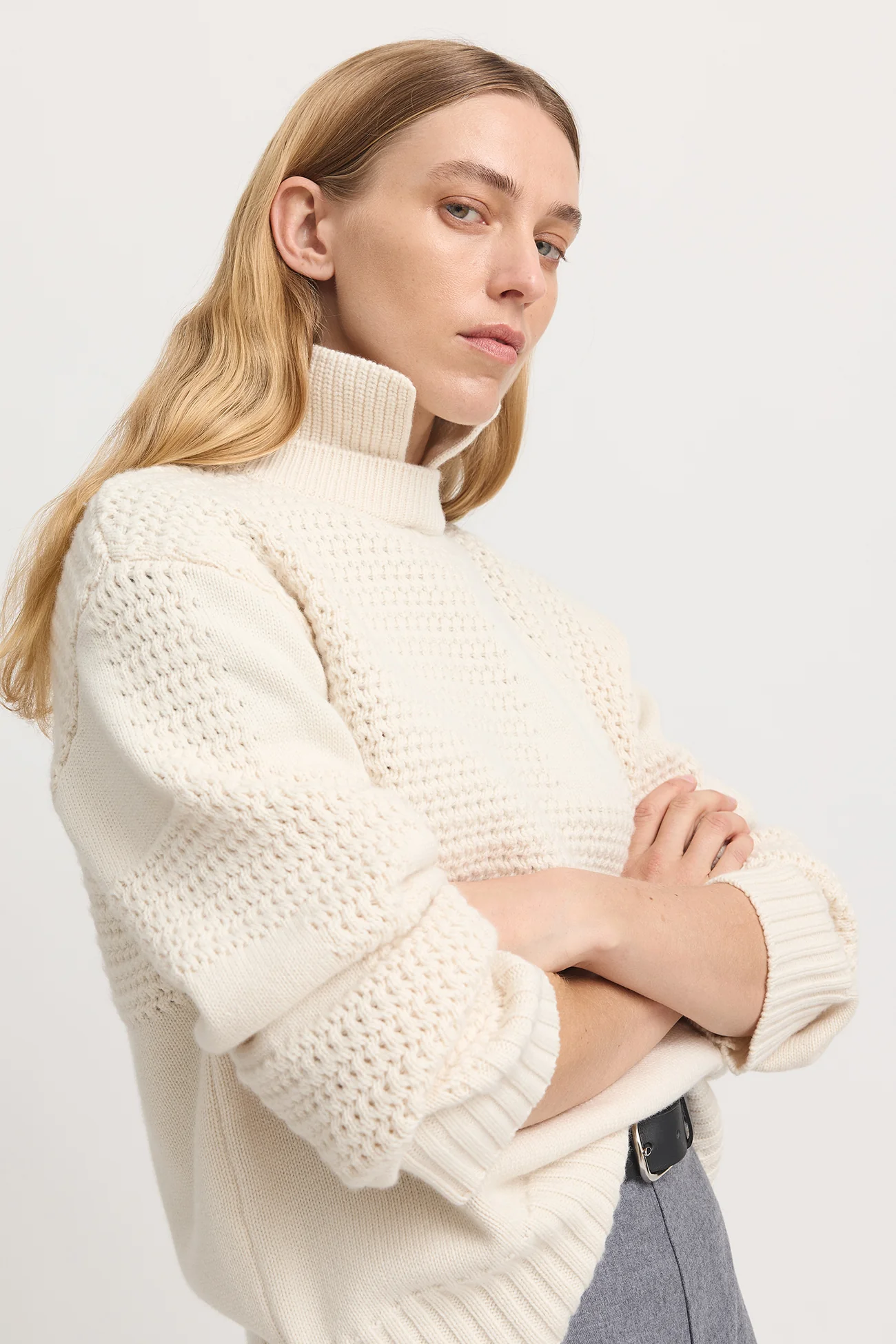 A showcase of contemporary craftsmanship, the Toorallie Textured Stitch Funnel wool knit blends racking stitch with single jersey to create a subtle patchwork effect and rich textural depth.