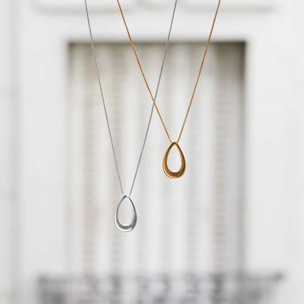 As effortless as a stroll through Paris in spring, the refreshing NAJO Vivante pendant captures the beauty of a passing shower—une ondée printanière. Her large, open droplet cascades from an Italian-crafted chain, like a raindrop caught mid-air. Fluid by nature, this layerable pendant evokes the intoxicating scent of wet cobblestones, the elegance of a silk trench, and the art of looking undone yet perfect.
