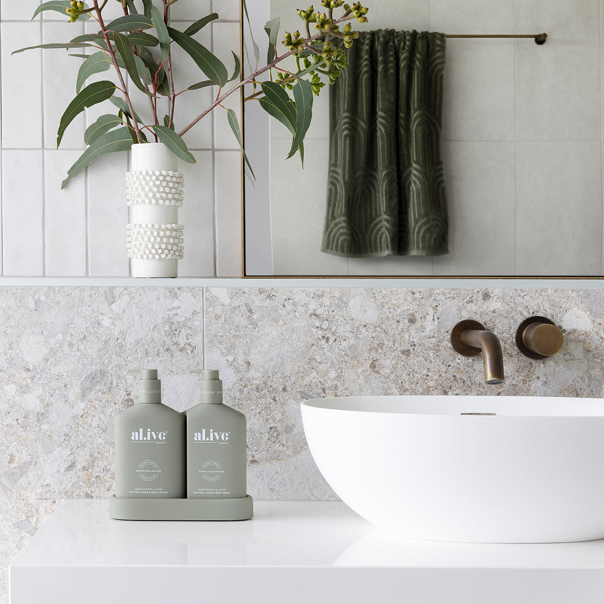 The al.ive body Wash & Lotion Duo in Green Pepper & Lotus contains a luxurious blend of naturally derived ingredients, fortified with essential oils and native botanical extracts.