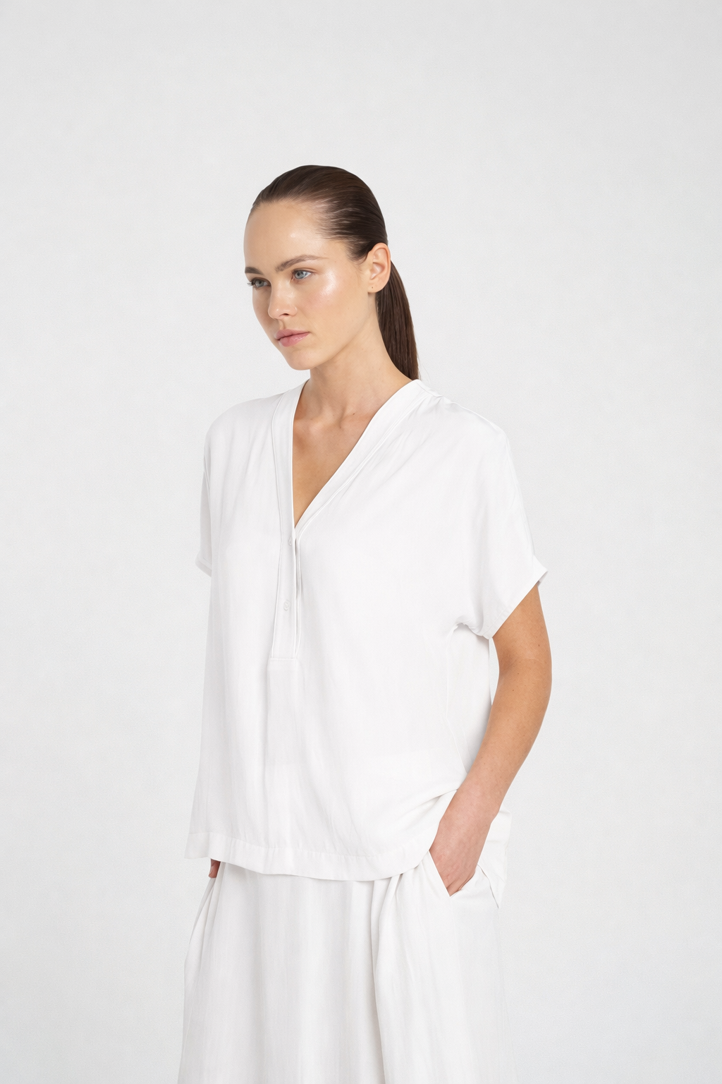Crafted from Mela Purdie's classic Mache, a fine Denier technical weave with an airflow finish. The 'Wedge Tab Shell' from Mela Purdie features a cap sleeve and a flattering neckline with a button closure.