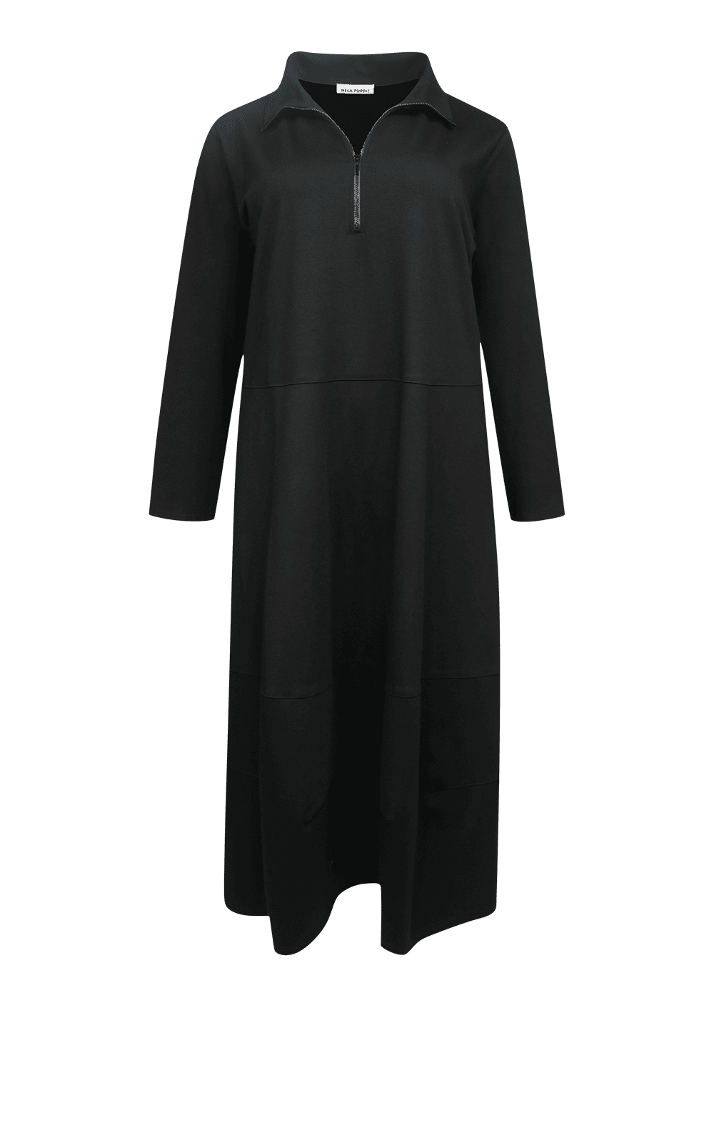 Crafted from luxurious Polished Ponte, this double-knit stretch fabric offers a smooth, sculpted silhouette with all-day comfort. The maxi-length design features expertly placed paneling to enhance shape and movement, while the crisp zip-up collar adds a contemporary edge. Complete with long sleeves and a gently curved hem, this dress is the perfect blend of polish and practicality.